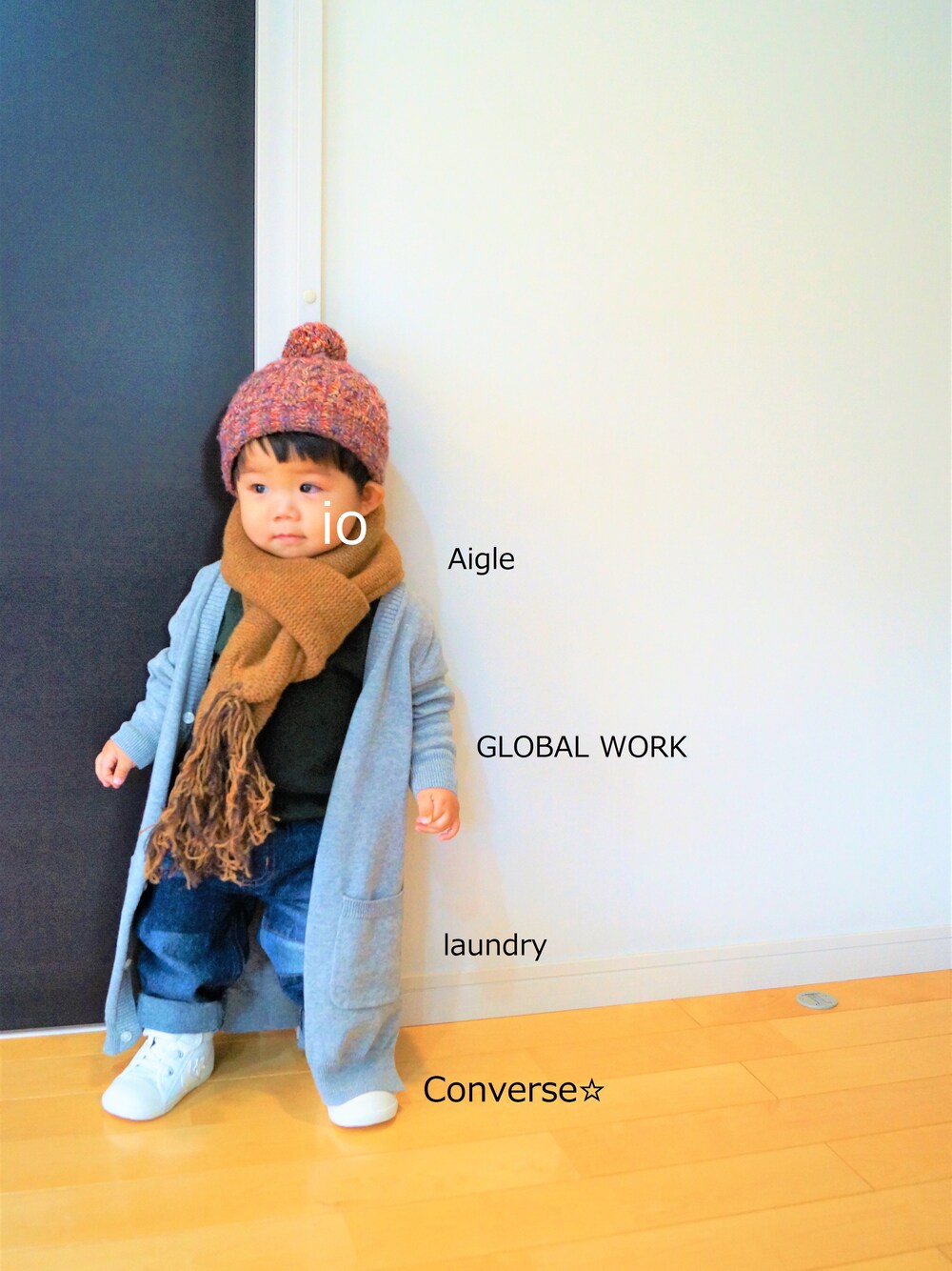 男の子でもかわいいロングカーデコーデ😁初めてのマフラーに嫌がりつつもパチリ❤