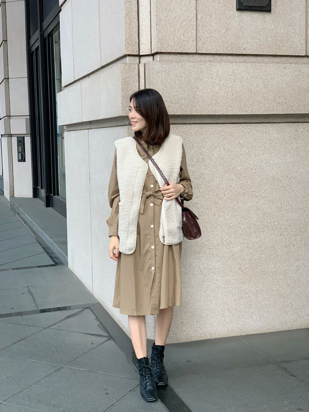 ベージュ系のベストを着用したレディースの冬コーディネートの1枚目の写真