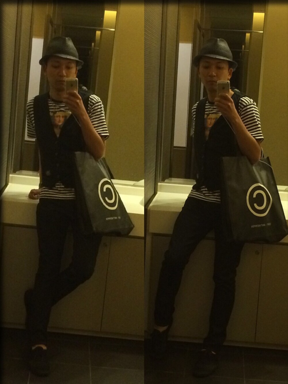 友達からもらったベルギーのアートブックショップCopyrightのエコバッグ。 帽子はH&M、Tシャツはspice of lifeです。