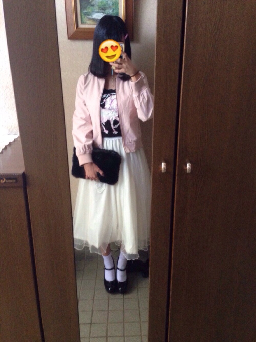 トップス:milklim ジャケット:WEGO スカート:secret honey バッグ:サンキューマート ソックス:WEGO シューズ:?? ヘアクリップ:KIKI