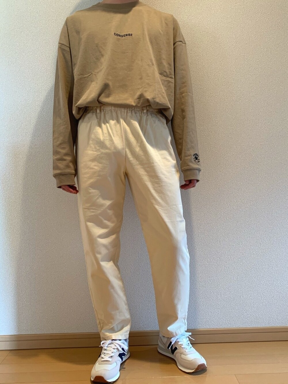 ご覧いただきありがとうございます! 今回はオーバーサイズロンTにダッドパンツを合わせてみました😊色合いも上はベージュで下はアイボリー、足元はホワイトというそれぞれの近い色でコーデしてみました! ロンTとパンツはそれぞれ3000円ちょっとで購入できるのでとてもオススメです👍 自分はZOZOTOWNのセールでそれぞれ2000円ほどで購入できたのであとは6000円ほどのスニーカーを合わせればアンダー1万円以下のコーデができるかも…😳