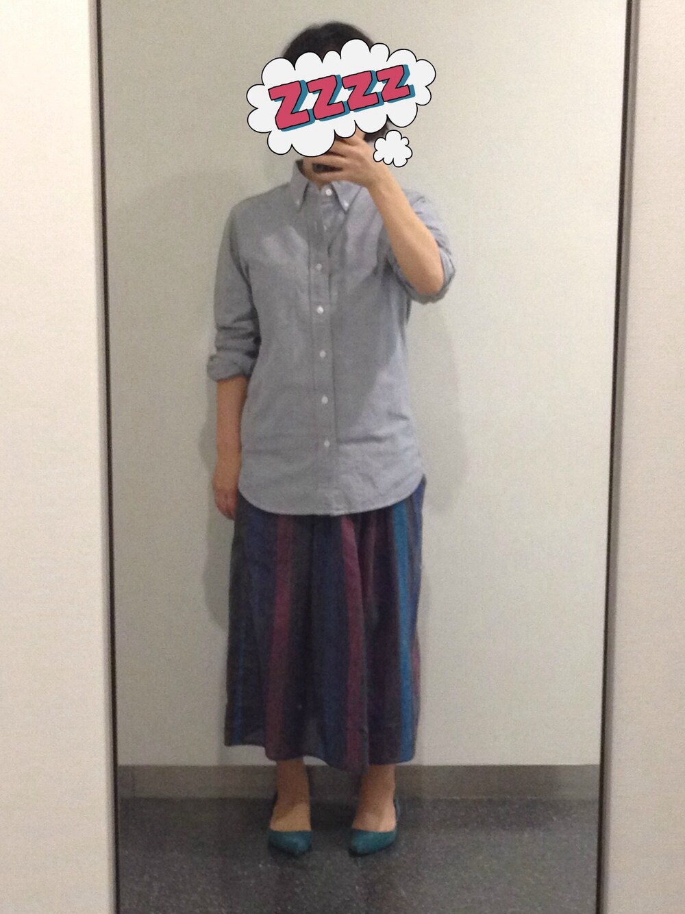 ボタンダウンシャツ:無印良品 MENS スカート:used ずっと持っていた安い古着スカートの丈が、今年は流行に一致しました! 色が気に入っています。