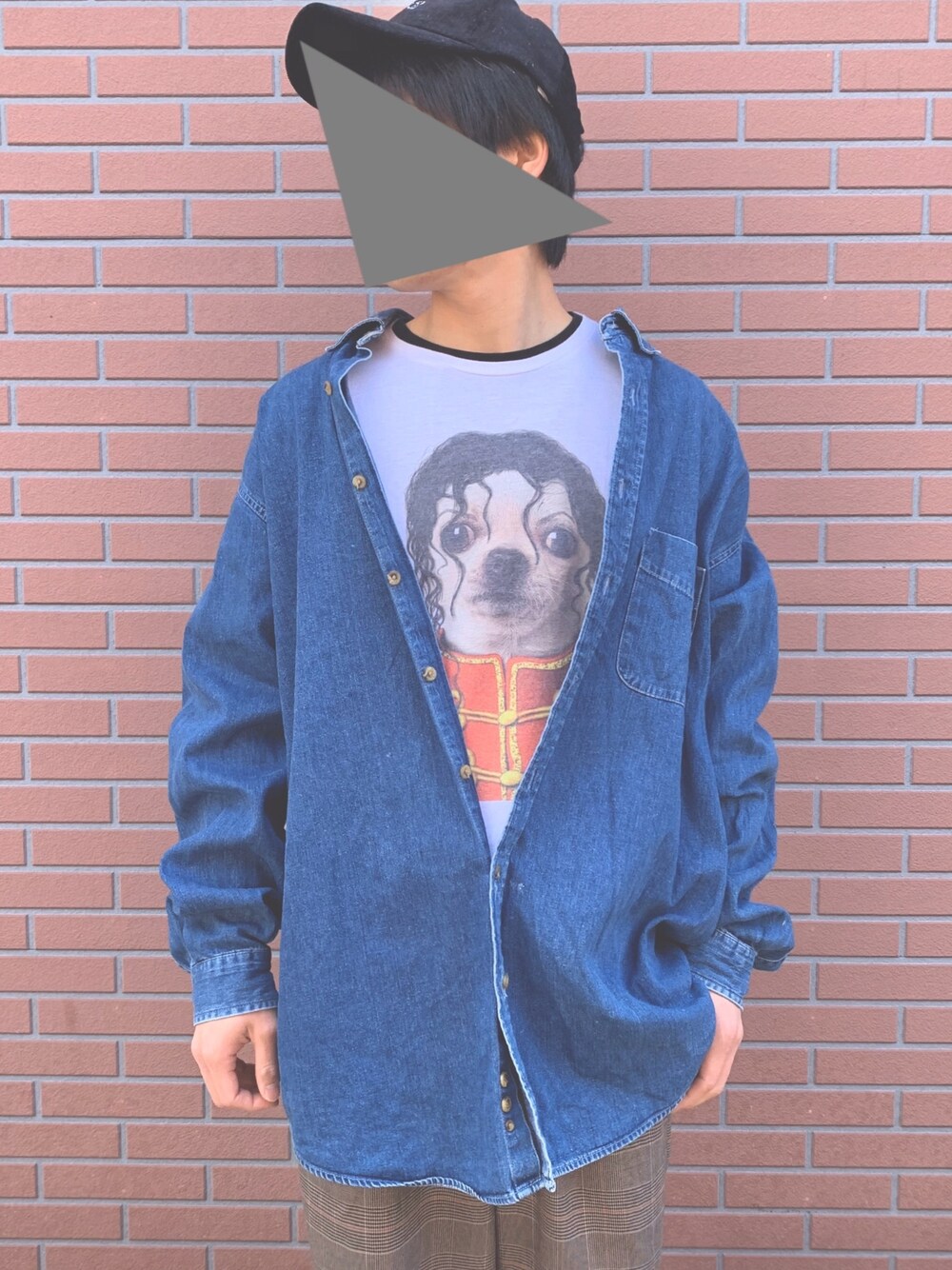 超ビッグシルエットのデニムシャツ! 中のカットソーはペッツロックのマイケル・ジャクソンTシャツ 眉毛が可愛いですよね〜