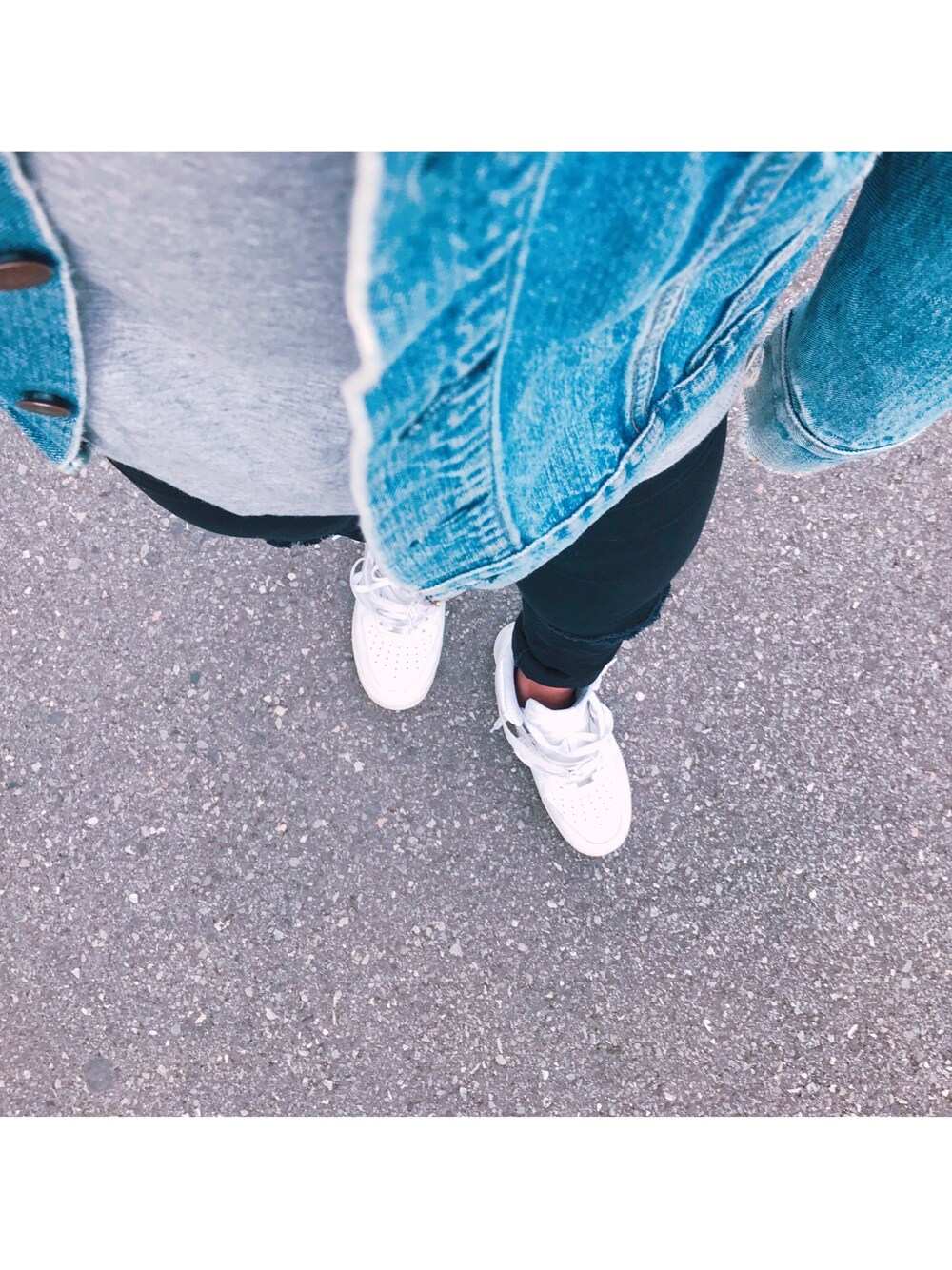 春らしいデニムを取り入れて、ダメージの入ったスキニーでボトムスはすっきりと。スニーカーはホワイトで少し明るめに!