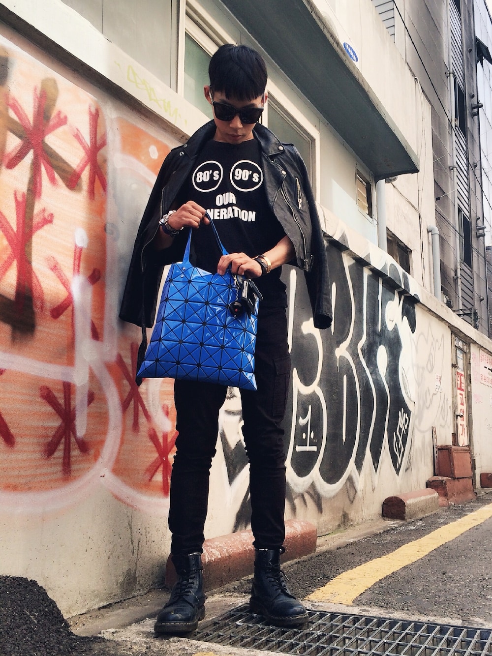 noir x bleu 80-90, our generation. t-shirt - UT pants - levis jacket - maison martin margiela 0 bag - baobao issey miyake shoe - dr.martens