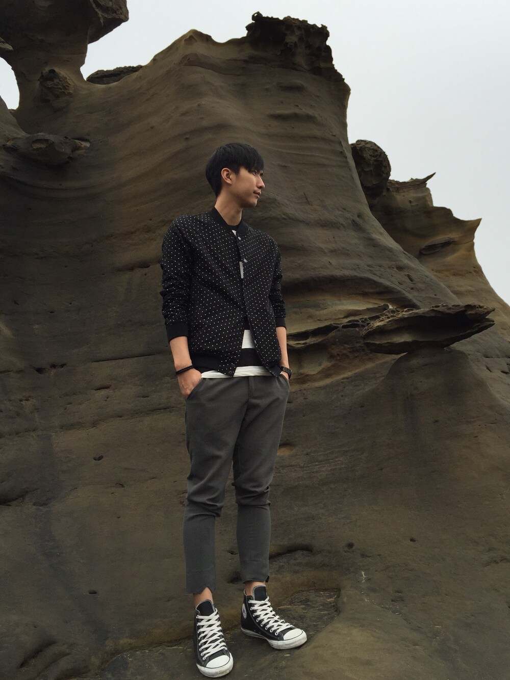 黑白條紋搭配黑底白點 鞋子也是黑白 褲子選用黑與白的中間色 灰 帶出來的效果不侷限於黑白 而是彩色的面貌