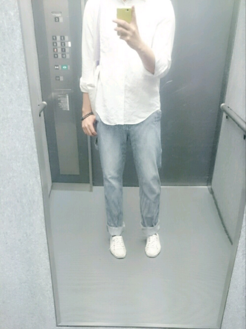 6月15日 真夏日みたいな天気だったので、白で統一。ジーンズは白水色のストライプで外して、見た目から涼しく行こうと。