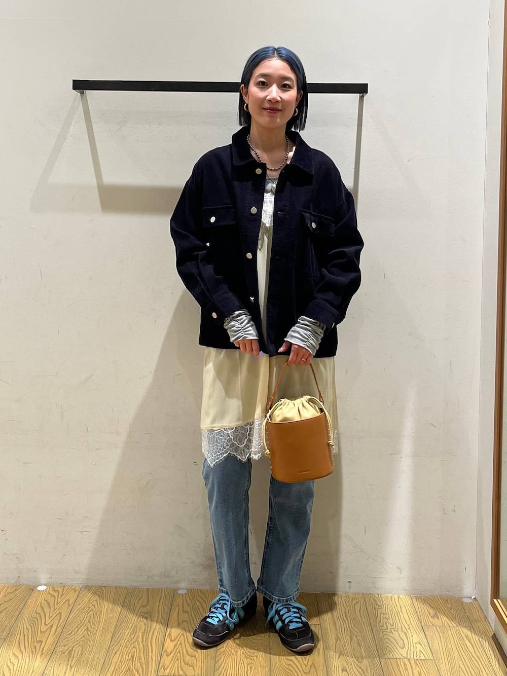 コーデュロイブルゾンは、黒に近いネイビーで深みのある色合いです。 裏地が付いてるので、春先までしっかりとアウターとして機能します! アウターのサイズ感は、身幅はゆったり 袖丈は手首までジャストでした! インナーを薄手にして、春っぽいコーデに! 手元からクシュクシュが見えるだけでおしゃれ見えします!