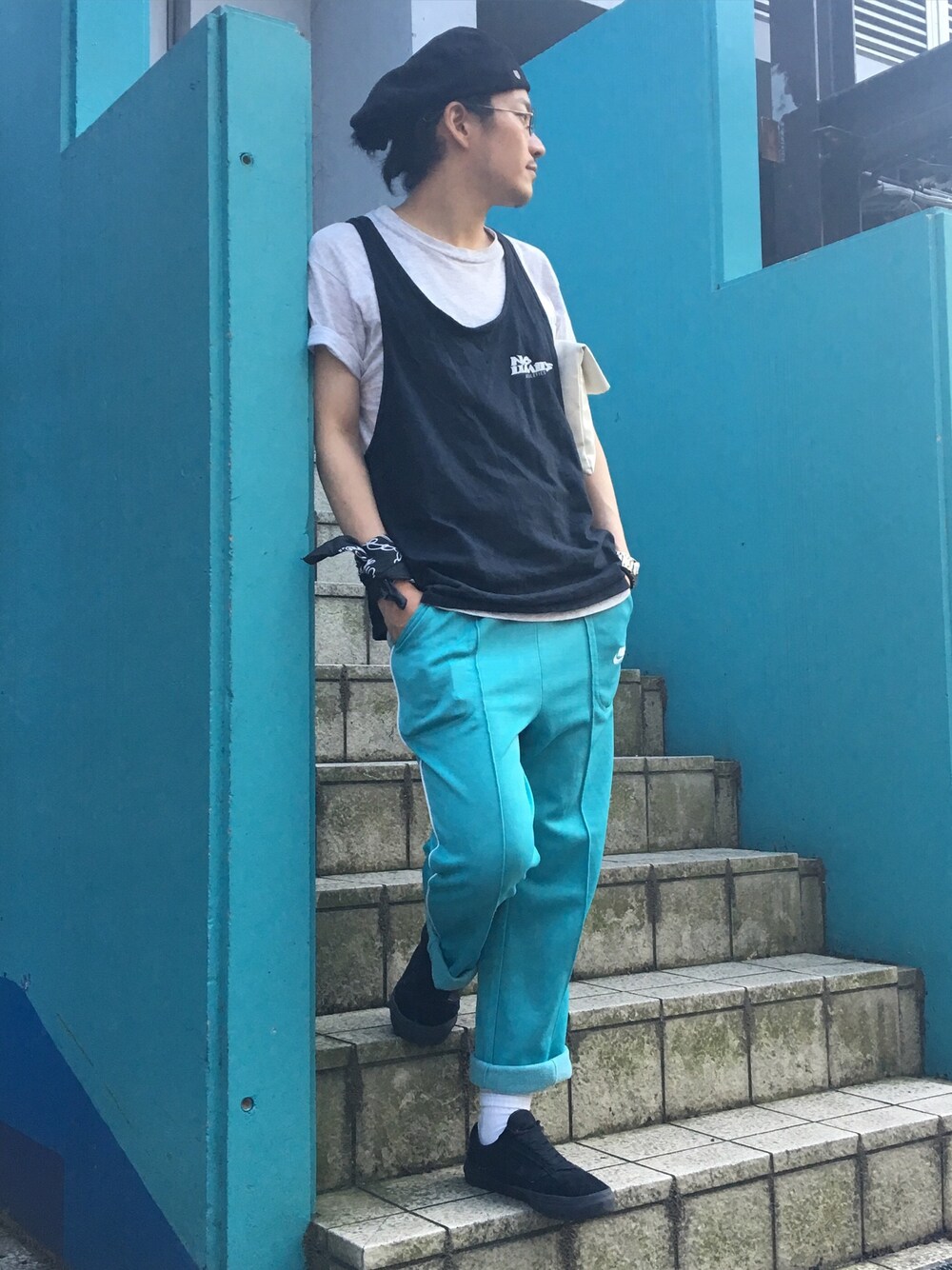 サックスブルーのnikeのジャージとドンキの裏口の階段の色がマッチしてたのでかっこつけて撮ってみました。 今年の夏はタンクトップを推していきたいと思ってるのですが、友達にはあんまり理解してもらえません。笑 ちなみに、タンクトップはNo Limitsです。 ほぼ全身古着です。