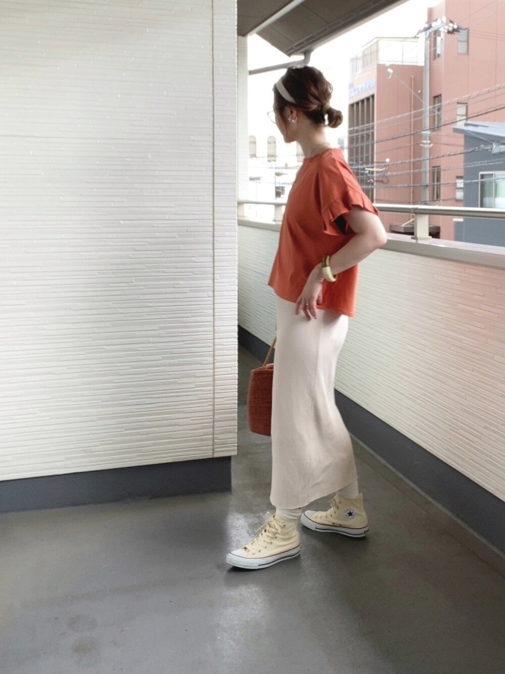 ソデのタックがかわいいTシャツ♡ オレンジカラーもgood❤︎ 白系ボトムスも合わせるのが好き♪ いつもありがとうございます☺︎ #pr