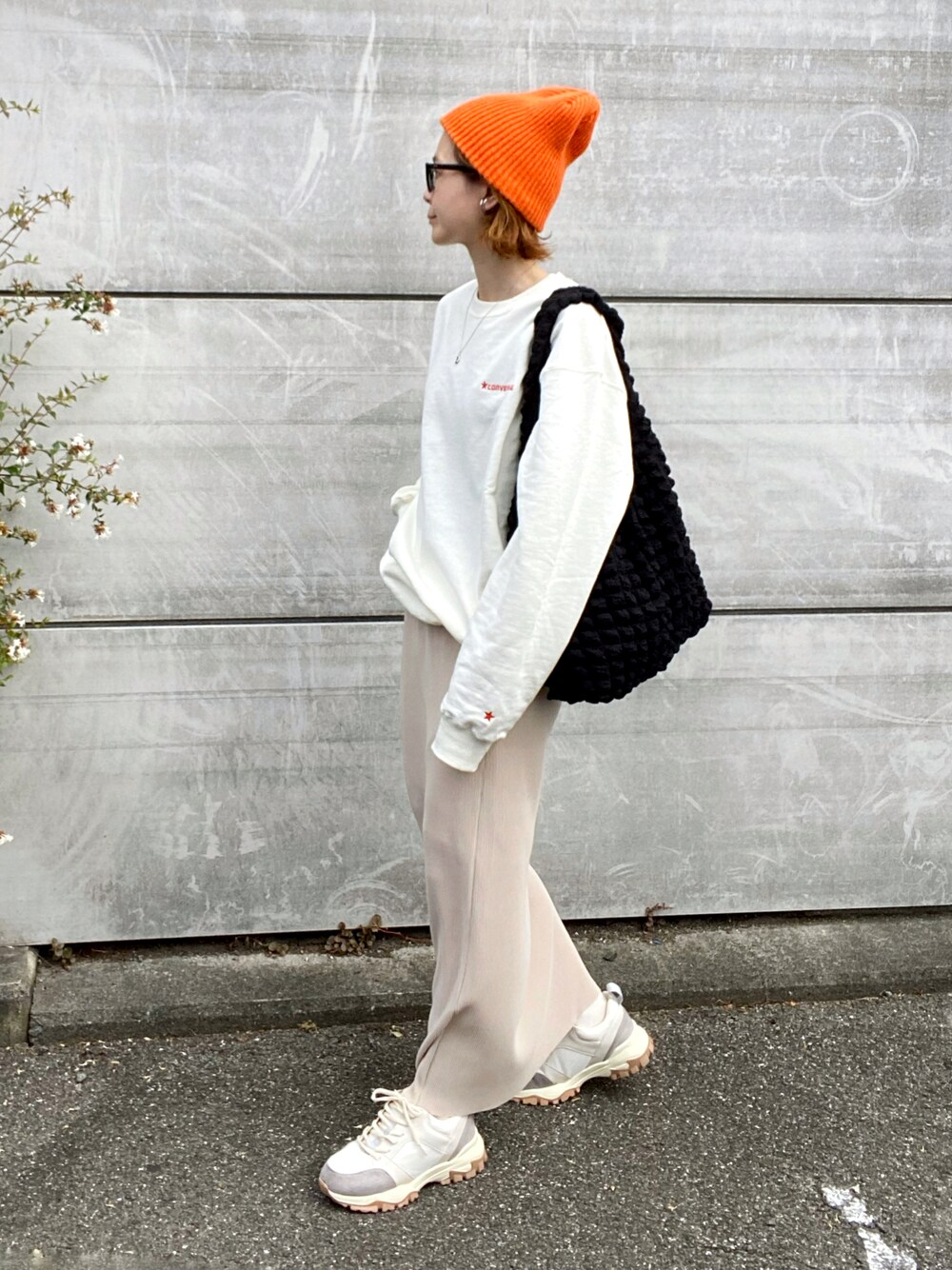 淡色コーデplusオレンジ帽♡ スウェット胸元の赤ロゴに寄せて オレンジニット帽♡ 袖の★もさりげにかわいいスウェット♡ 見ていただきありがとうございます☺︎ ☆PR