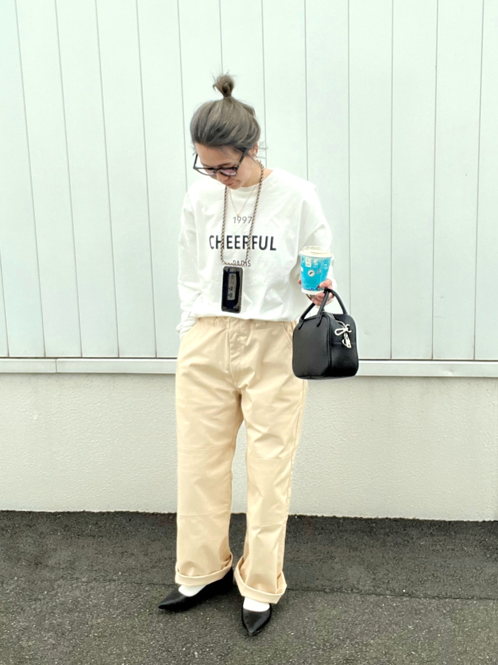 シンプルコーデ♡ 春カラーなベージュが お気に入りのワークパンツ♡ パンプスと合わせて、 タックインして 大人っぽい感じの ミックスコーデしてみました☺︎ 見ていただきありがとうございます♪
