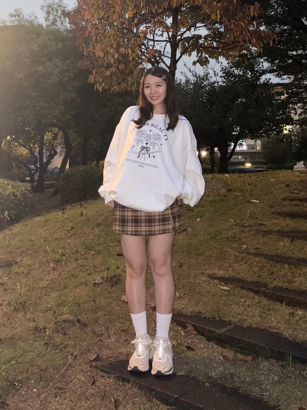 ゆったりスウェットをチェックスカートと合わせてトレンドのプレッピーコーデに♡