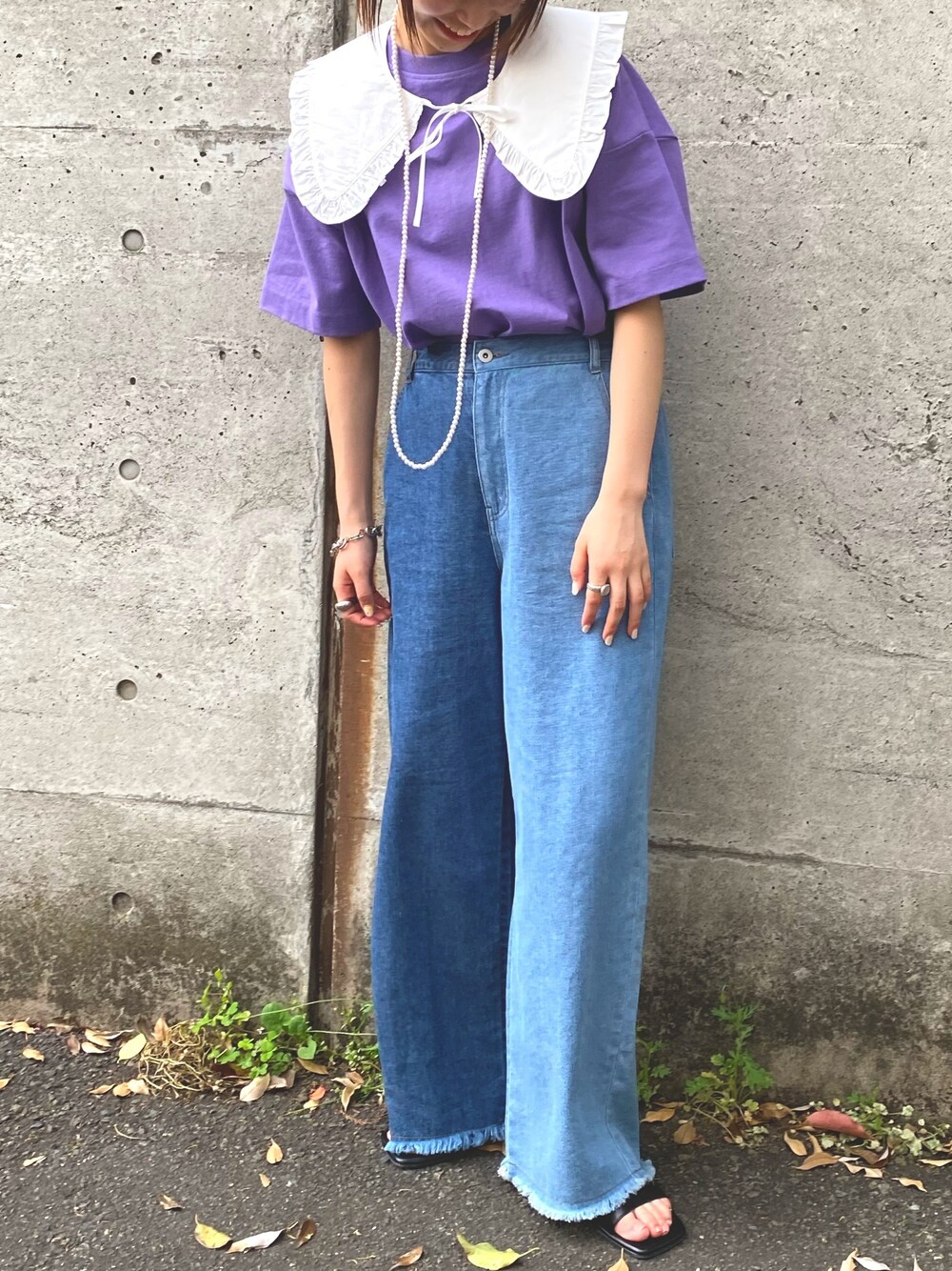 カジュアルなコーデもつけ襟をつけたりパールのネックレスを重ねたりすると雰囲気がガラッと変わります!