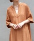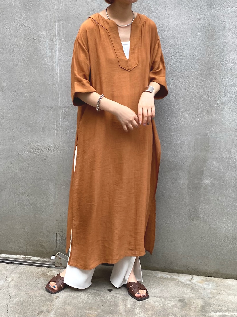 パイピングがポイントのカフタンワンピース。 大人なイエローカラーが落ち着いた印象を与えてくれます。 さらっとした楊柳素材が夏にぴったりです!