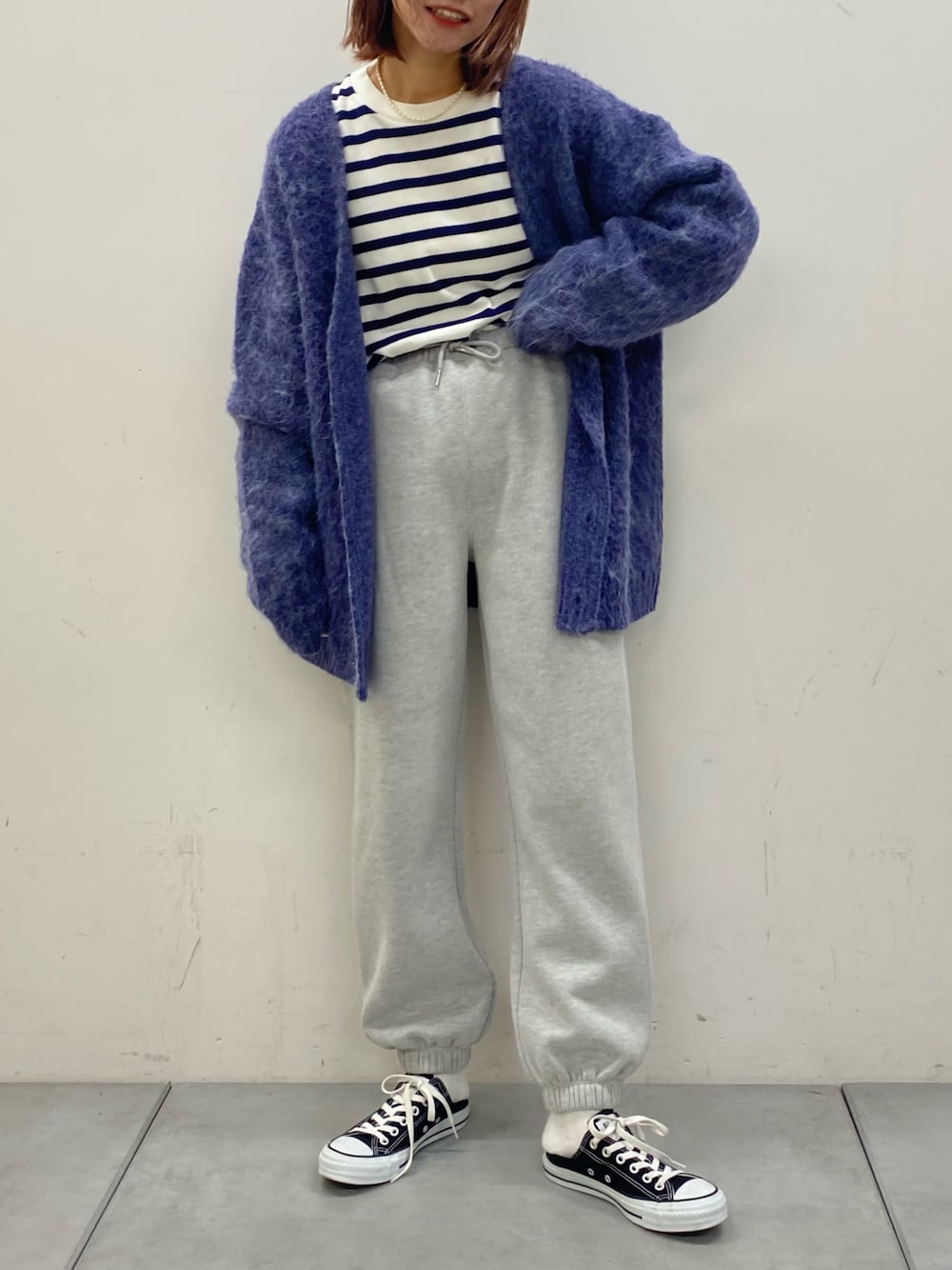 トレンドのカーディガンとスウェットパンツを合わせたコーデ。 ゆったりとしたメンズのカーディガンは女性にもおすすめです!