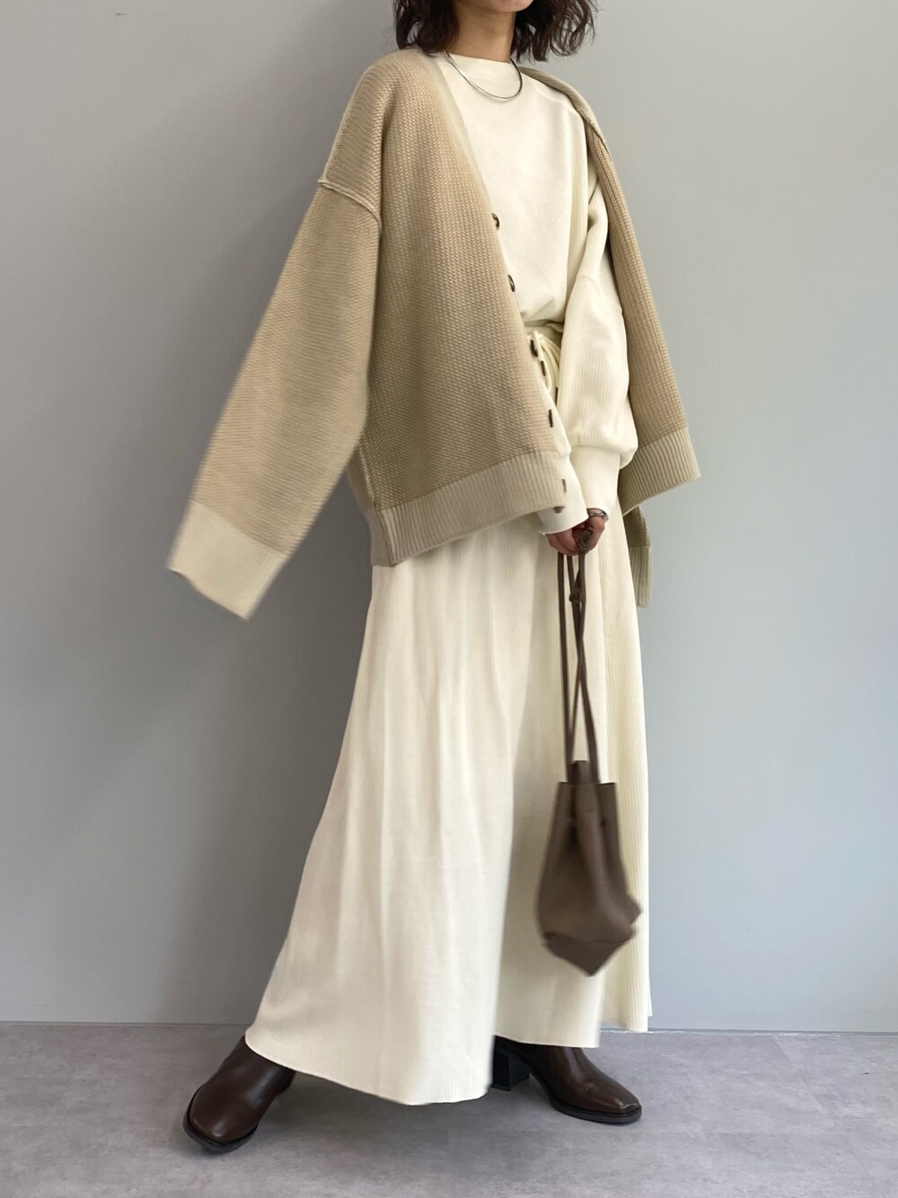 メンズのカーディガンを使ったベージュのワントーンコーデ。 ワッフル素材のセットアップは女性らしいマーメイドシルエットなので楽ちんがらもきちんと感のあるコーデに! instagram▶︎@teri0_____