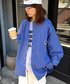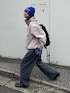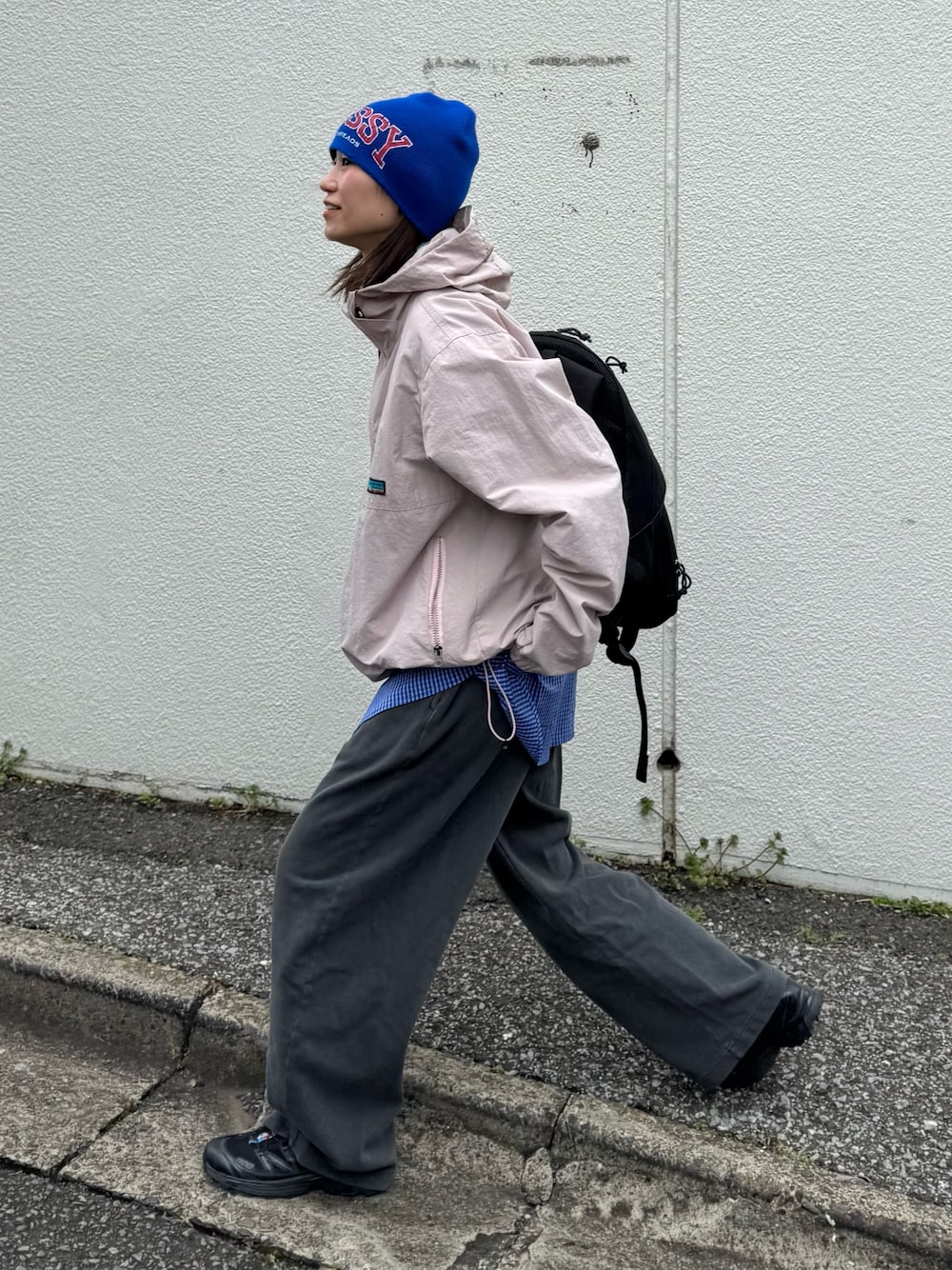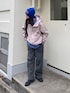 春らしいピンクのマウンテンパーカーに、 シャツとビーニーてブルーを差し色にした春のスポーティーコーデ。