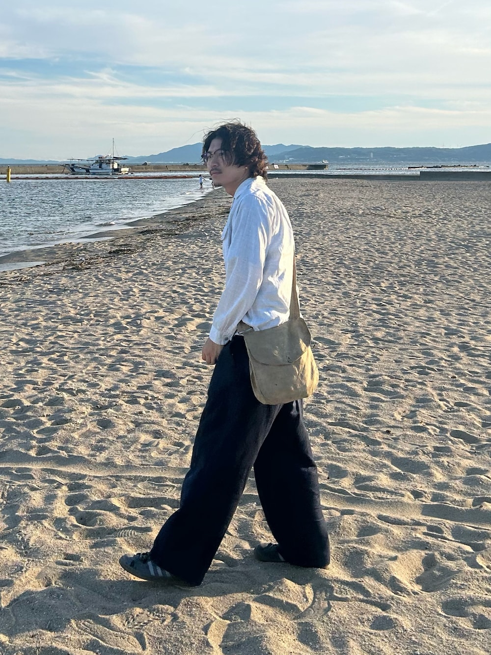 50年代の白シャツにネイビーのワイドスラックスを合わせてグレーのアディダススニーカーで少しカジュアルにしました。
