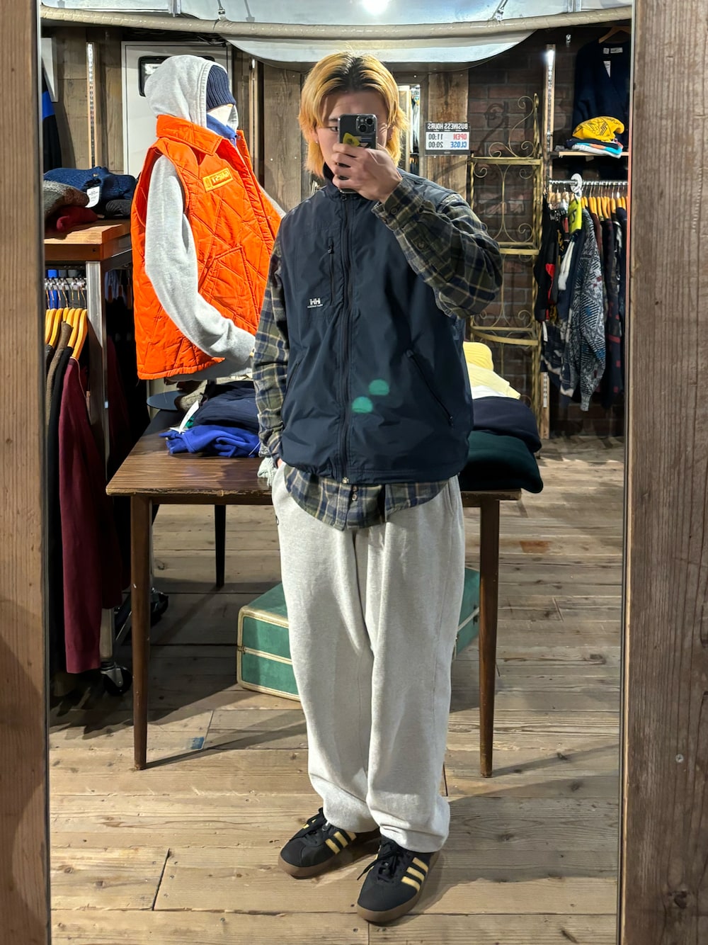 チェックシャツにアウトドアベストを重ねた、90’sムード漂うレイヤードスタイル。 グレーのスウェットパンツで力を抜きつつ、足元はスニーカーでストリート感をプラス。 全体をナチュラルトーンでまとめることで、古着らしいリラックス感と温かみのある雰囲気に仕上げました。 休日のカジュアルスタイルにもぴったりな一着です。