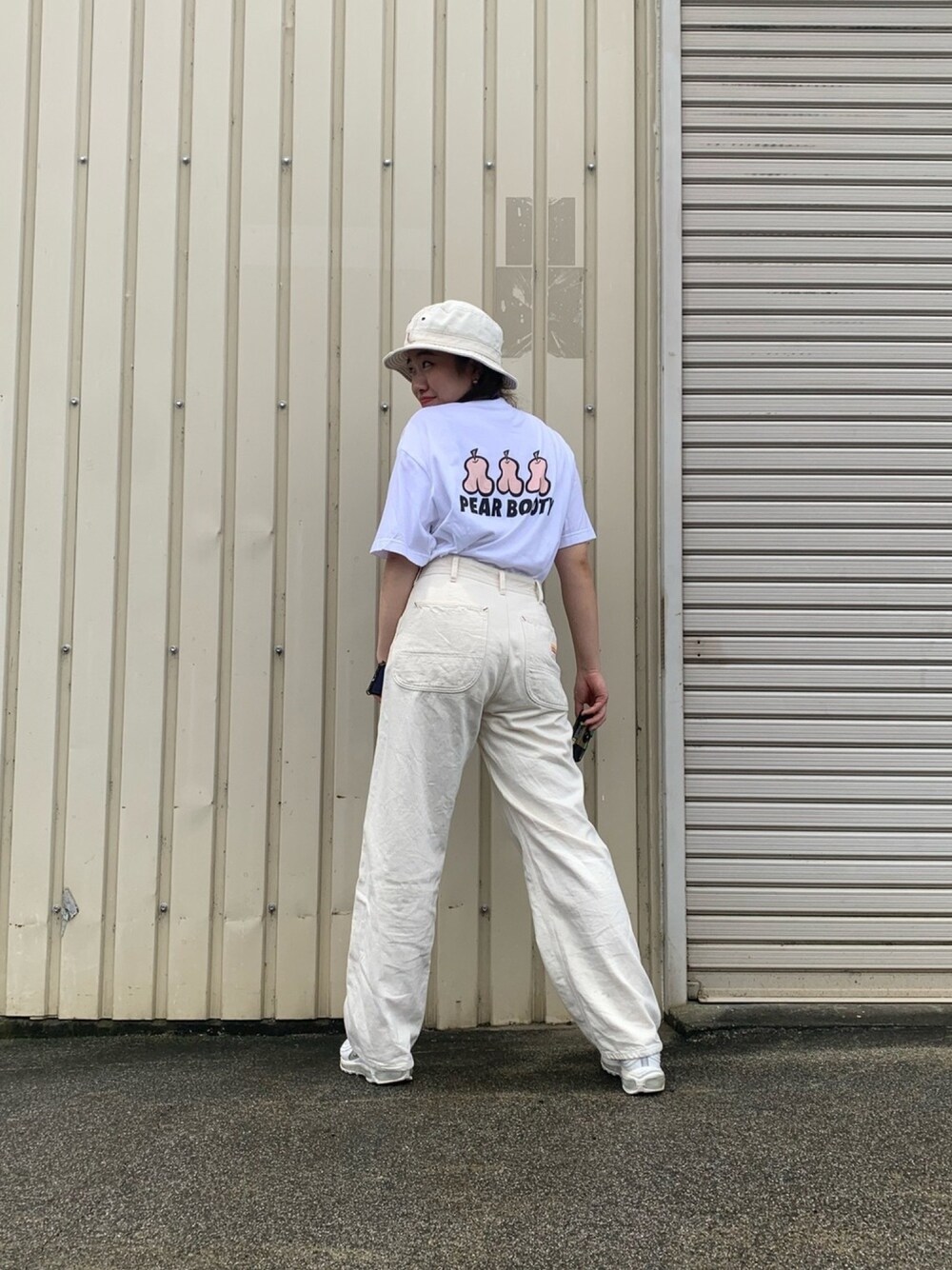 みてくださり ありがとうございます💗 オールホワイトコーデ Tシャツは自分でデザインしました🍑 フルーツのおしりをモチーフにした Tシャツです🍑🍐