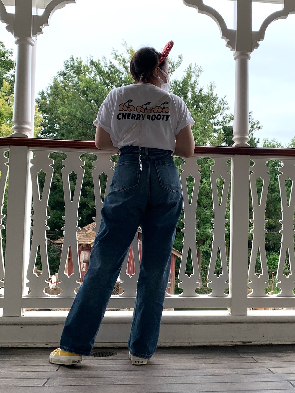 ディズニーコーデ BUTT FRUITSのチェリーブーティーと ハイウエストのデニムでかわいい❤️ 決めはイエローのコンバース☀️