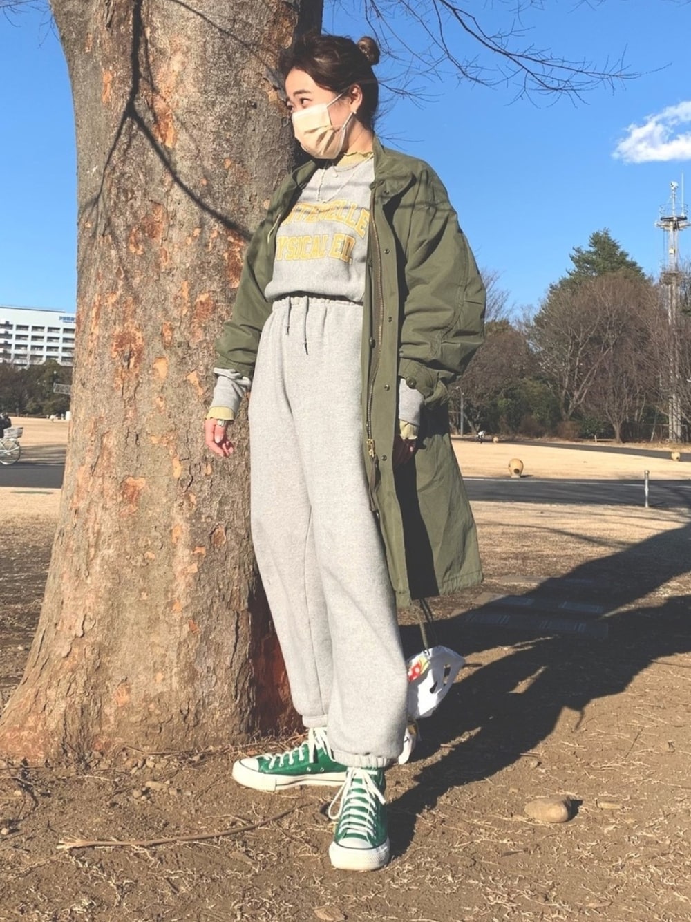 見てくださりありがとうございます🐮 スウェットコーデ🤍 FREAK'S STOREのM-65のアウター めちゃヘビロテです グリーン系を差し色に入れております💚