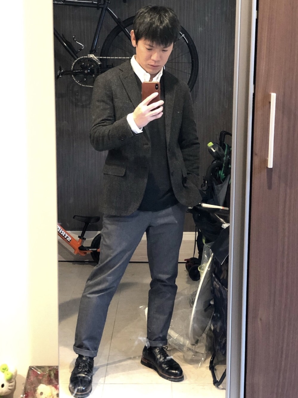 ちゃんとした日用のモノトーンコーデです。 いわゆるドレスコードでスマートカジュアル指定された時の格好ですかね。 グリーンレーベルで購入した、オフで使える起毛ウールのジャケットは前からこーいうのが欲しかったので早速お気に入りです。なるべく毛羽立たないよう、大事に使っていきたいです。 ユニクロのファインメリノはジャストサイズはMですが、Lサイズにして少し緩めにしています。 今回モノトーンにしたのであまり色遊びがないですが、ジャケットの下をタートルネックの白ニットだったり、Vネックでも赤とか緑とかにして遊び心を入れたり、紫と青の中間みたいな色のニットで上品さを入れてもいいかなと思います。
