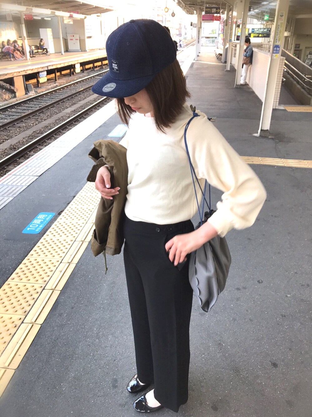 久しぶりの投稿! 田舎の駅にて。 キャップはかぶってません! 人のです!!! このニット、 着すぎて、 ボロボロ。 もう1つ欲しい!!! 巾着タイプのこのバッグ、 お気に入り❤️ なんてない、 コーディネートでした!!!