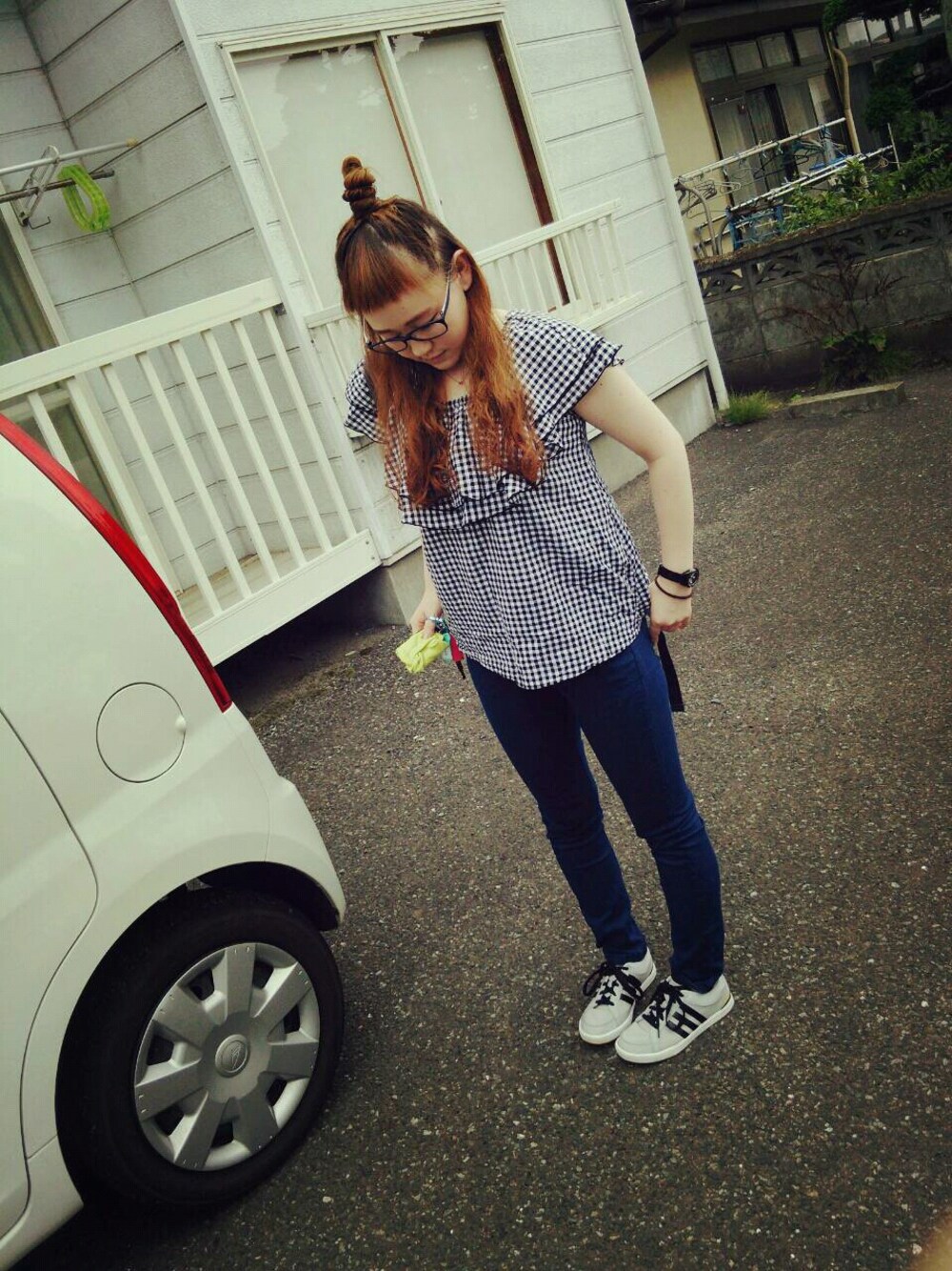 おねとお出掛け🚗🐦 天気は曇のち雨。 久しぶりのパンツ👖 チェックは自分に合わないから 全然着ないけど、思い切ってチャレンジ♘♤