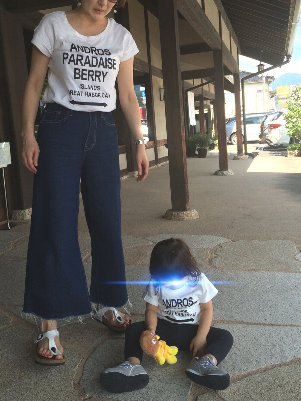 なぜ地べたに座る(笑) この日は川遊びでずぶ濡れになった娘だったので体が冷えるだろうと、長ズボンに着替えさせました。 プレゼントに頂いたお揃いのTシャツに喜ぶ娘。