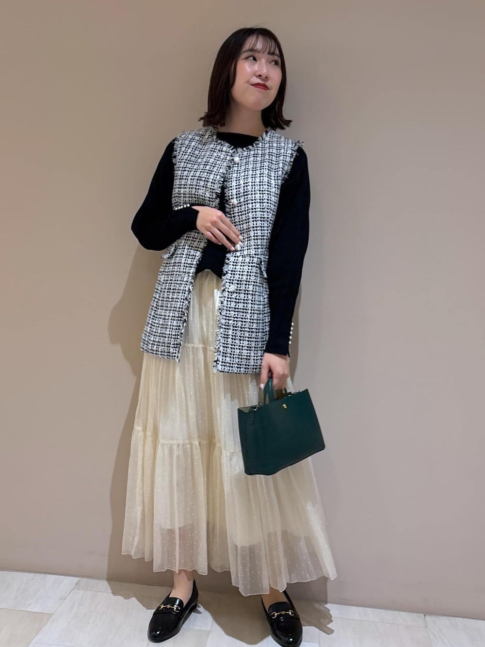 毎年人気の袖パールニットにトレンドのツイードジレを合わせた大人キレイめコーデ。 ちょっとした食事会や学校行事、お出掛けにもぴったりなコーデです! ジレと同色のニットを合わせることで、より引き締まりオシャレ見えします。 バッグにカラー物を選ぶと映えます。