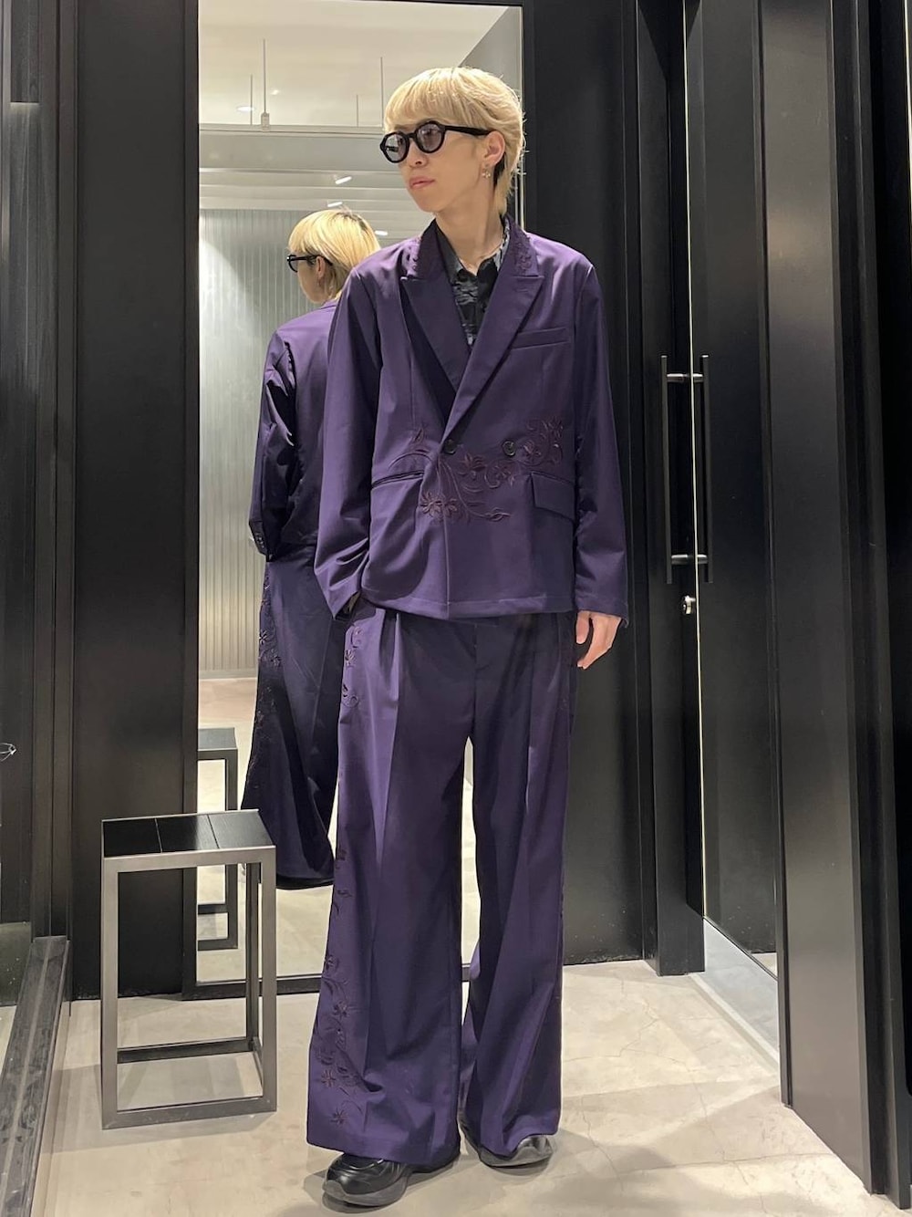 ⚪︎ジャケット 花柄刺繍が目を惹く、モードなジャケット。 DESIGN クラシックなピークドラペルのダブルブレストジャケットをベースに、繊細で芸術的なフラワーモチーフの刺繍を施した、HAREらしいモードな一着。 ラペルからフロントにかけて流れるように配置された刺繍が、ミニマルなボディに映え、洗練された佇まいの中にさりげない色気と個性をプラスします。 全体的に程よくゆとりを持たせたシルエットで、構築的でありながらもリラックスした着用感を実現。 主張のあるデザインながらもディテールを削ぎ落とすことで、シャツやカットソーの上からさらっと羽織るだけでスタイリングが決まる、バランスの取れた主役級アイテムです。 ⚪︎ パンツ 花柄刺繍が目を惹く、モードなワイドパンツ。 DESIGN クラシックなスラックスをベースに、両サイドを流れるように彩るフラワーモチーフの刺繍が圧倒的な存在感を放つ一本。 サイドラインに沿って配置された刺繍が、縦のラインを強調し、脚長効果とともにモードで華やかな印象を与えます。 腰回りにはタックを施し、裾に向かってストンと落ちるワイドシルエットを採用。 歩くたびに美しいドレープが生まれ、リラックス感がありながらも上品で洗練された立ち姿を演出。 同素材のダブルジャケットとのセットアップは、成人式やパーティーなどのオケージョンシーンにも映える至高のスタイルです。