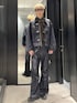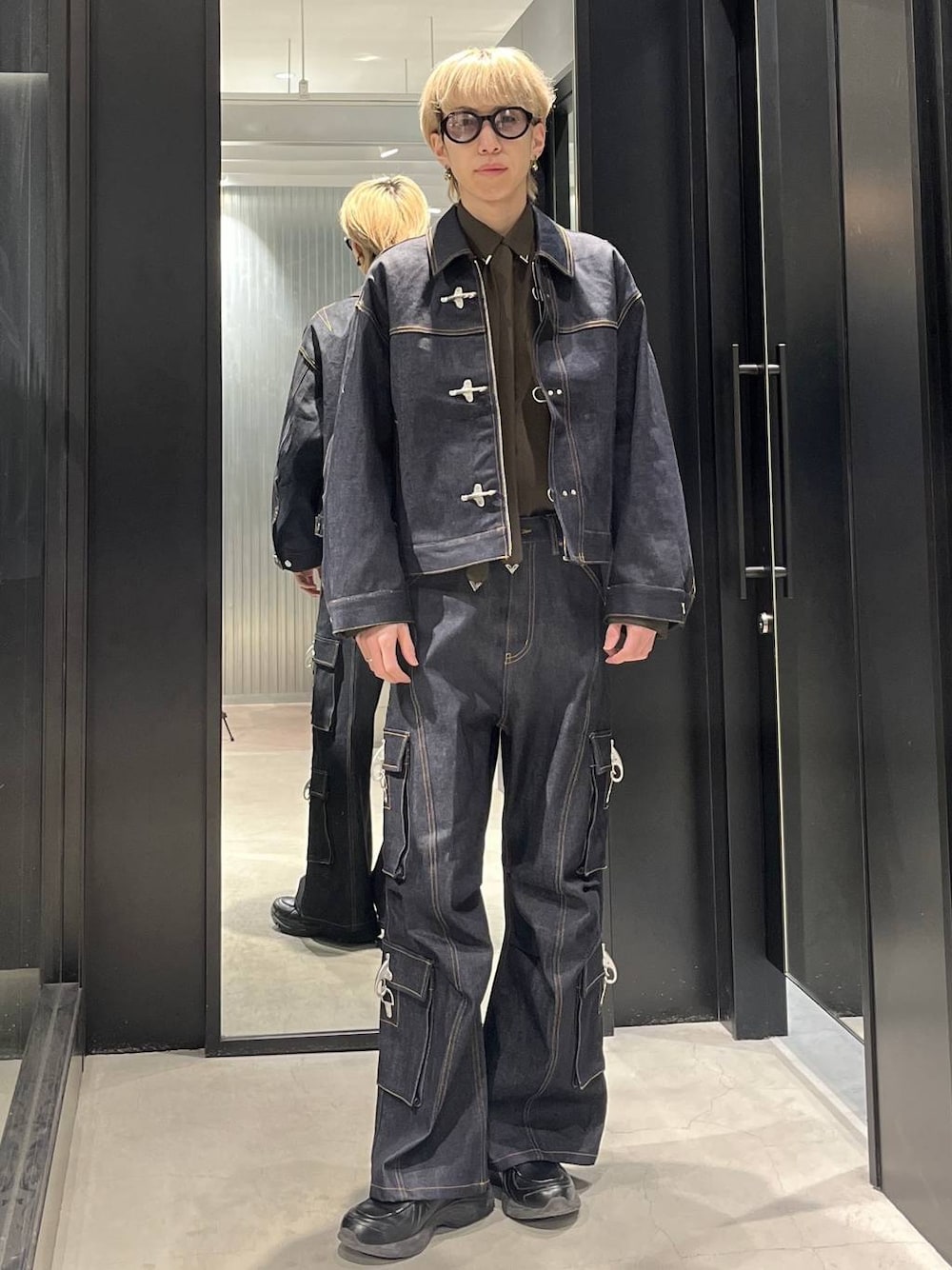 トレンドのファイヤーマンバックルのデニムセットアップにボウタイシャツ合わせのハレらしいスタイリング ⚪︎ブルゾン 身幅を広くとったやや短丈でコンパクトなシルエットに設計し、どんなインナーを入れても羽織りやすく、綺麗に見えます。また冬など寒い時期はコートなどのインナーとしても使用するなどアレンジも〇 ⚪︎パンツ 膝下からカーブするように広がる立体的なワイドシルエットで、唯一無二の変形シルエットが他のデニムパンツとは被らず個性を表現できるデザイン。
