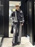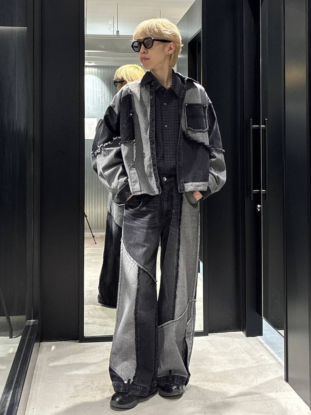 ⚪︎サイコウチクデニムシャツ デニムの表地と裏地をランダムに繋ぎ合わせることで、唯一無二の表情を引き出した再構築デザインシャツ。 DESIGN 表裏の生地をランダムに配置し、あえて左右非対称に設計。着用するだけで圧倒的な存在感を放ち、計算された切りっぱなしデザインが、スタイリングに奥行きと躍動感を与えます。 フロントだけでなく、背面にも大胆な切り替えを施しているため、360度どこから見てもサマになる完成度の高い仕上がりです。 同デザインのパンツも展開しており、上下で合わせることで、より世界観を強調したセットアップスタイルをお楽しみいただけます。