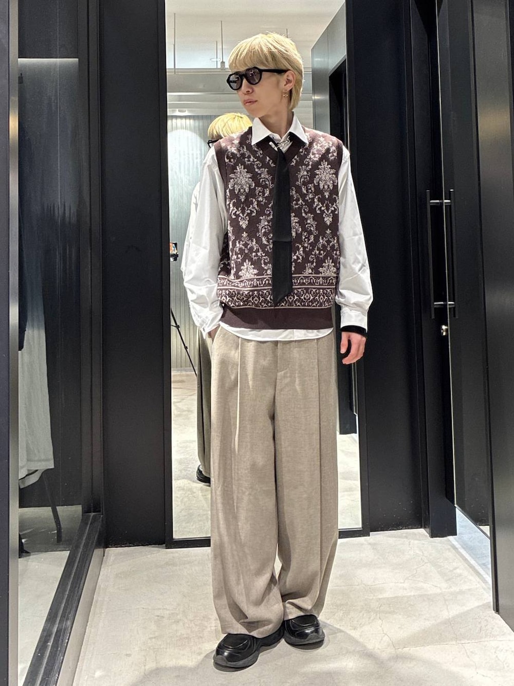 ⚪︎ダマスクガラニットベスト 世界のトレンドを凝縮。コンパクトなシルエットと品格漂うダマスク柄が、最旬のレイヤードを叶えるニットベスト。 DESIGN 海外のストリートやSNSでも注目を集めている「コンパクトなニットベスト」を主役にしたレイヤードスタイルを提案する一着。 あえてタイトめ、かつショート丈に設定したミニマルなシルエットが最大の魅力で、シャツやカットソーに重ねるだけで自然と重心が上がり、瞬時に今どきなY2Kやフレンチシックのムードを演出します。 首元は深めのVネック仕様になっており、インナーの襟との重なりも美しく決まります。 トップスがコンパクトな分、ボリュームのあるワイドパンツなどを合わせることで、メリハリの効いた洗練されたAラインシルエットが完成します。