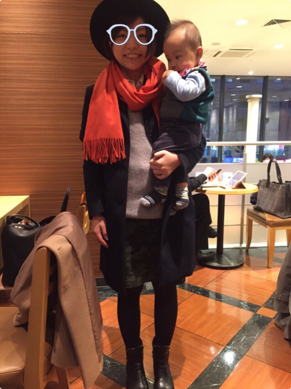 UNIQLOコーデ オレンジマフラーと帽子と靴で少しオシャレ感をだしました