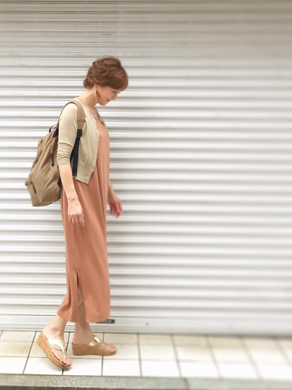 ワンピースコーディネート テラコッタカラーのワンピース ブラウンベージュをベースにした 同トーンカラー 大人カジュアル夏コーデ