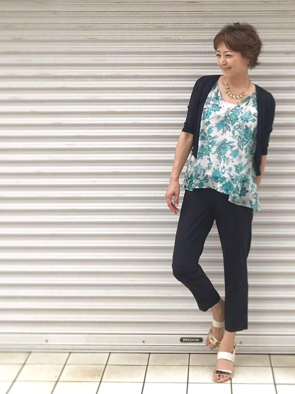大人のシンプルコーディネート 大人カジュアルファッション ネイビーでIラインのフォルム アクセントに花がらブラウスで華やかさを演出しました。