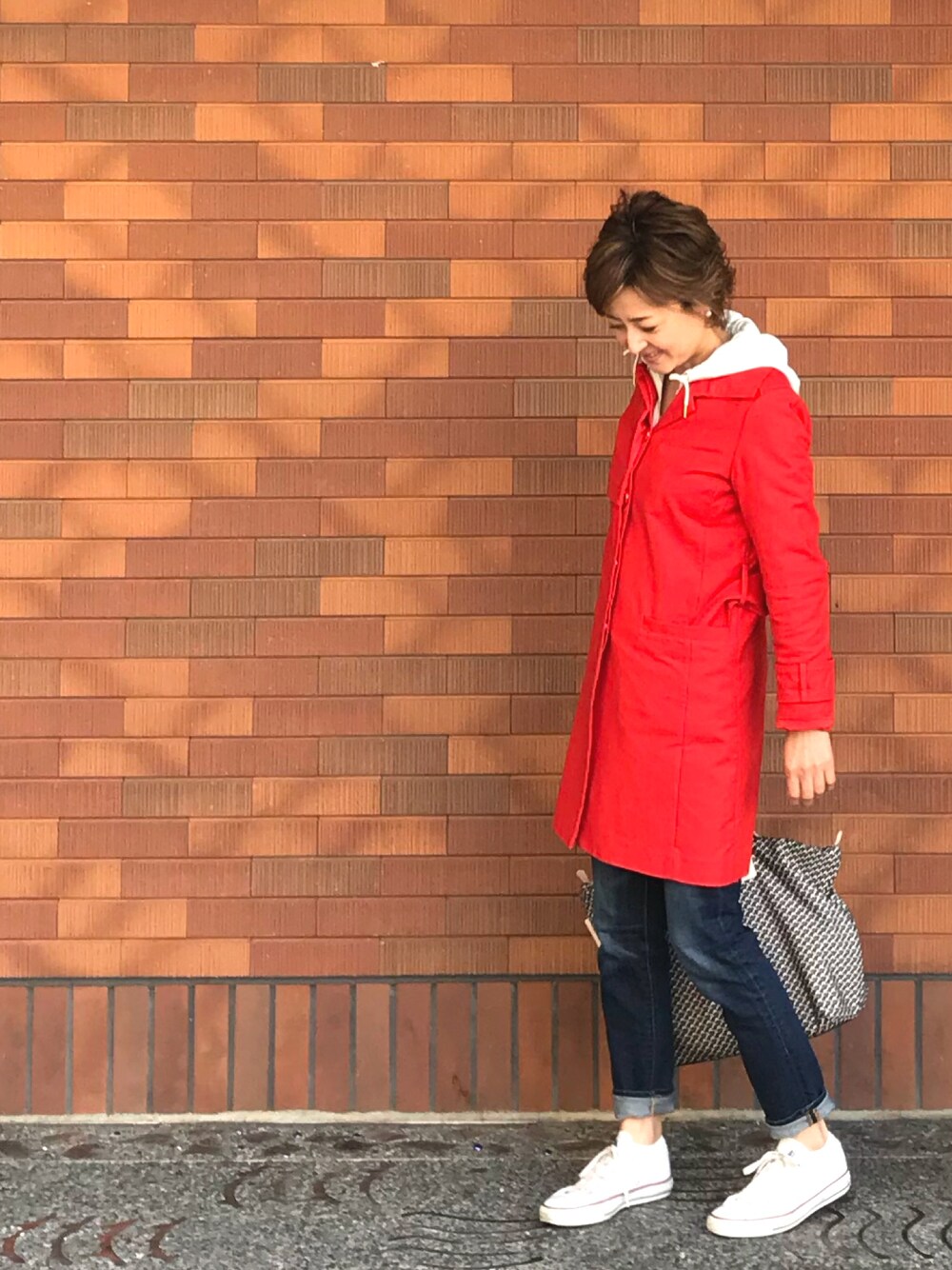春コートを纏った シンプルカジュアルコーディネート 40代コーデ カジュアルな定番スタイルを取り入れた シンプルなスタイルは 古今東西変わらないアイテム 朱赤のコートが元気さと明るさを演出