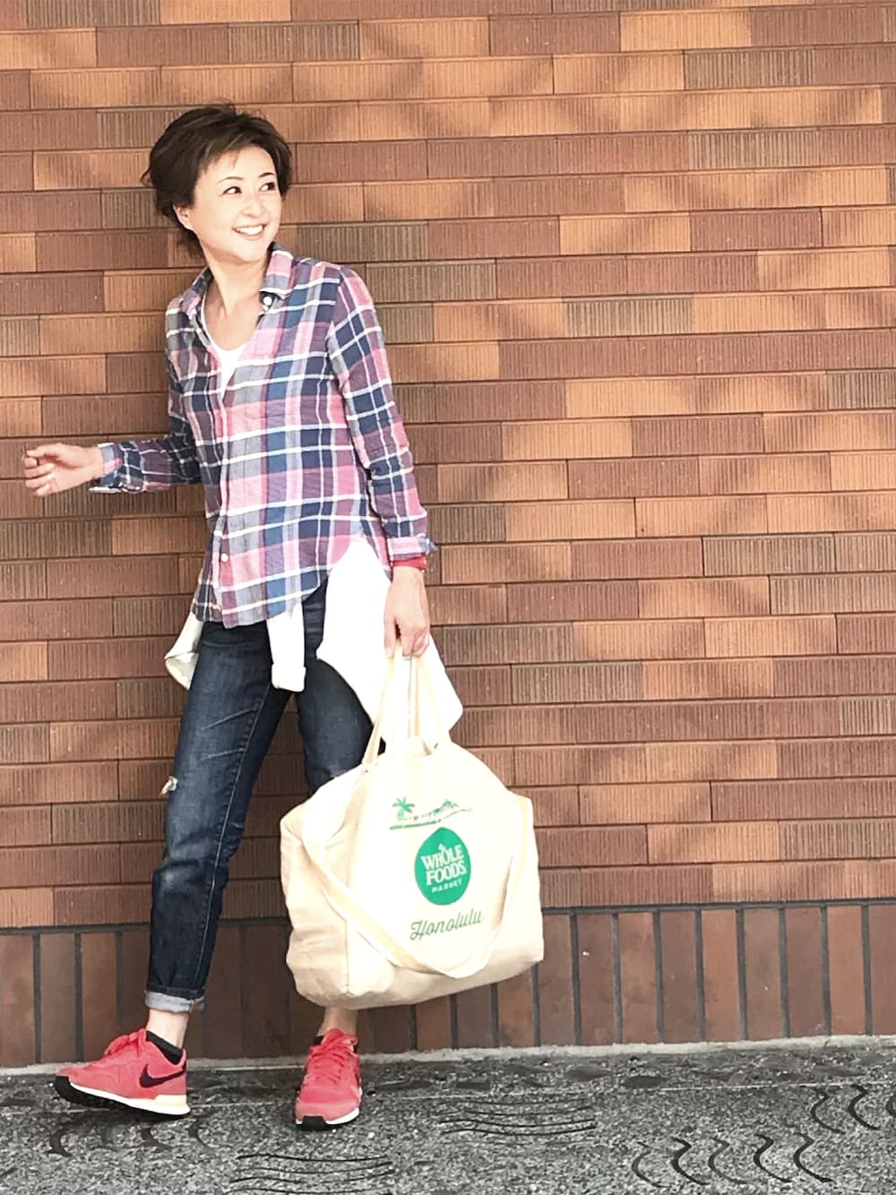 大人カジュアルSTYLE 流行りを用いないアイテムを基準に コーディネートしながら 今っぽさを感じてもらえればとスタイリングしています。 柄シャツとデニム アクセントに赤のナイキ シンプルなアイテムだけど 明るく元気な春の大人カジュアルコーディネート