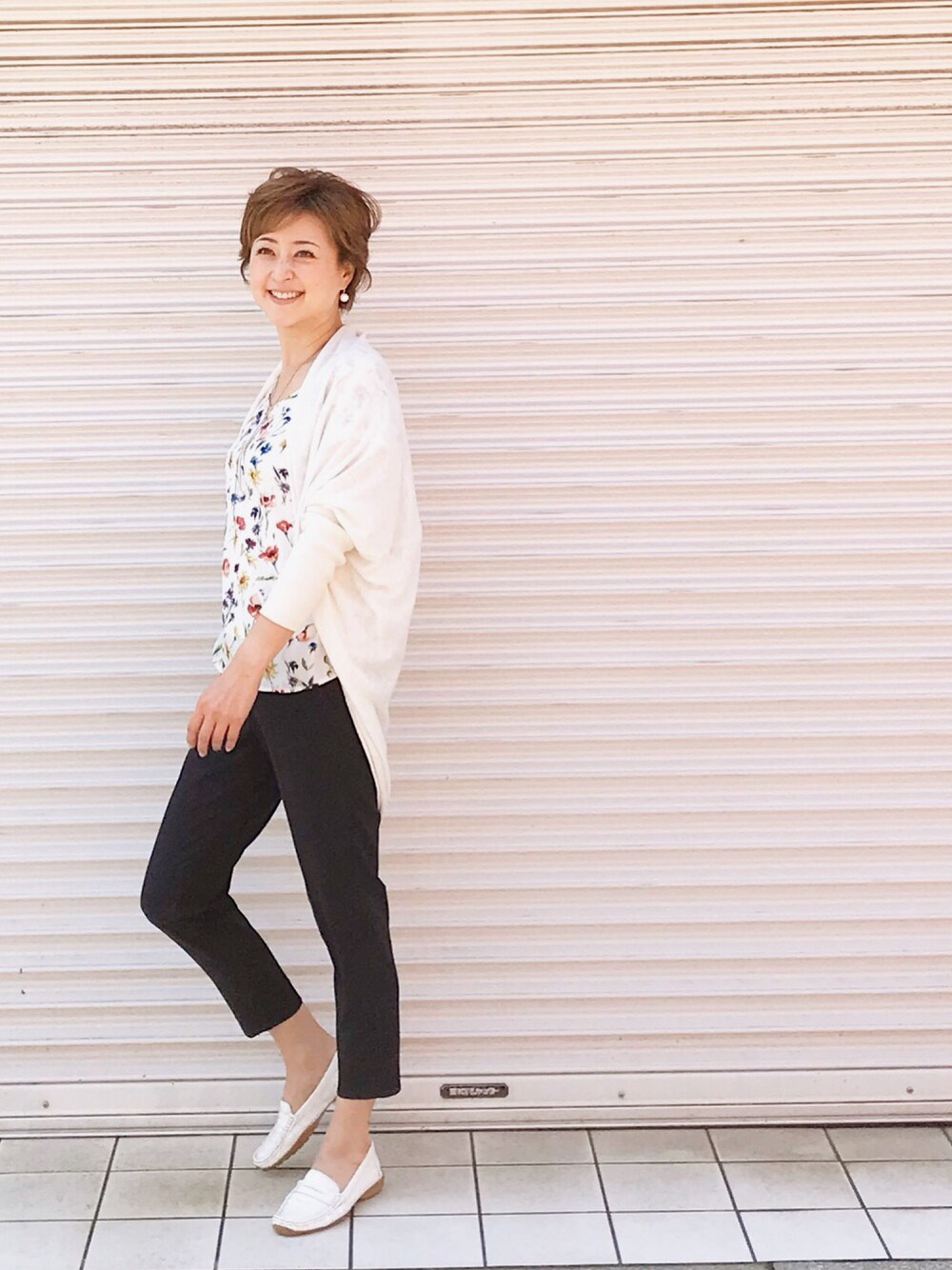 大人カジュアルコーディネート 花柄ブラウスを主役にするために 万能のネイビーパンツを組み合わせて トップスにバランスを合わせ ホワイトでトーンを統一した シンプルだけどどこか大人の可愛らしさを感じるコーディネート