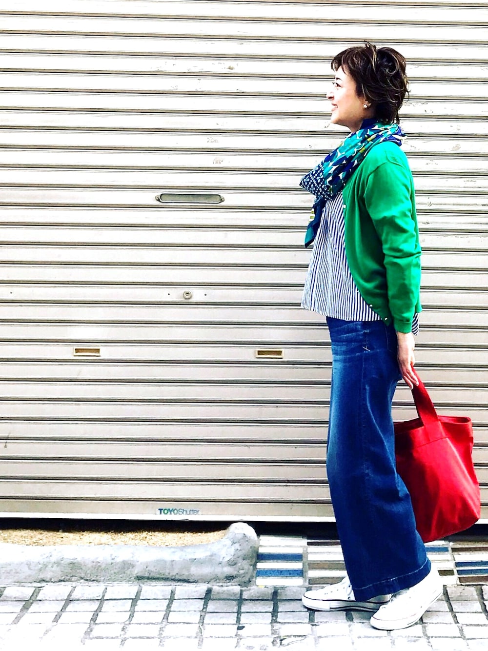 レッド系のトートバッグを着用したレディースの春コーディネートの1枚目の写真