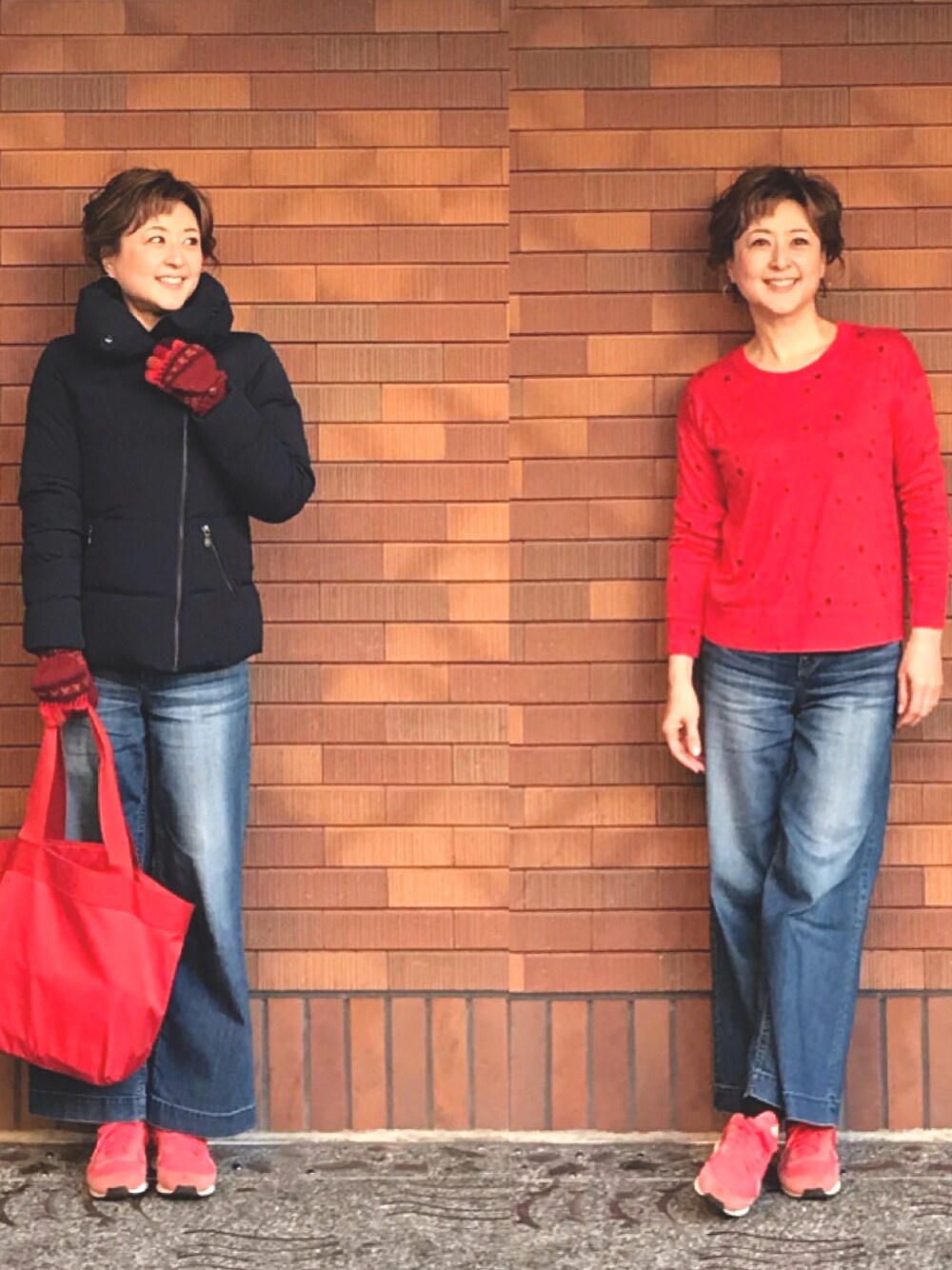 大人カジュアルコーディネート 赤&ネイビーコーデ デニムを基準に 赤 セーター 赤 スニーカー 赤 トートバッグ 2トーンで明るく元気に♪♪♬〜♪♪♩♪♩