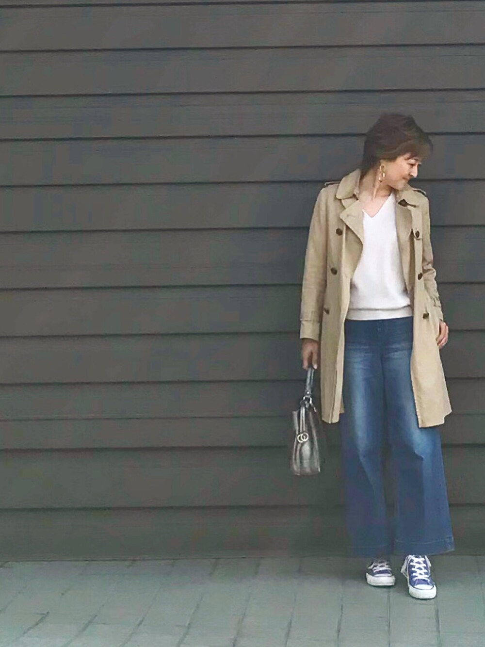 ブルー系のデニムパンツを着用したレディースの春コーディネートの1枚目の写真