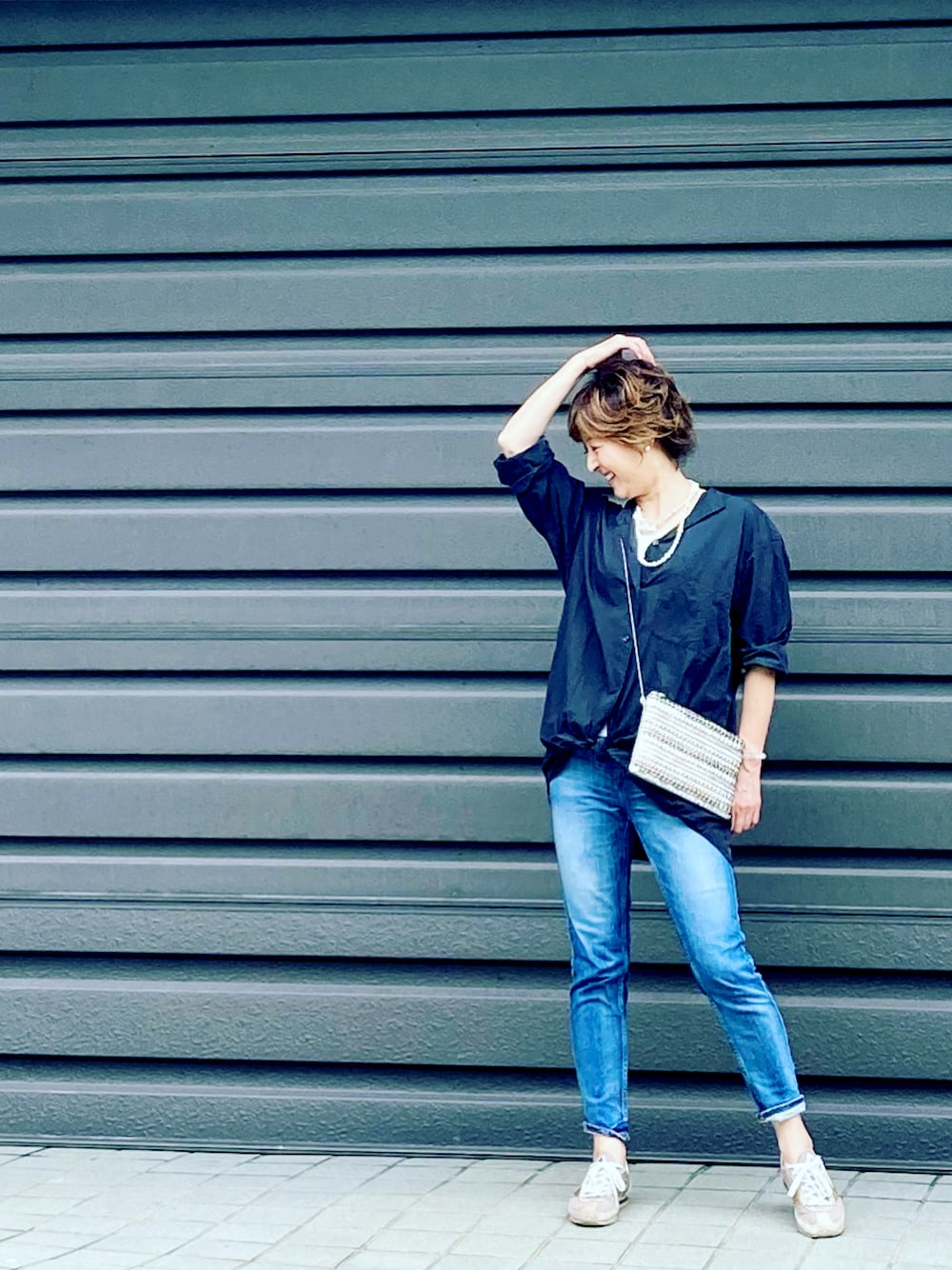50代の秋コーデ ネイビーブラウス+ブルーデニム ワントーンで大人LINEを確立 ファッションは 流行に流されず 年齢の波に乗っちゃう! 小物は シルバーポシェットで スッキリ抜け感を演出