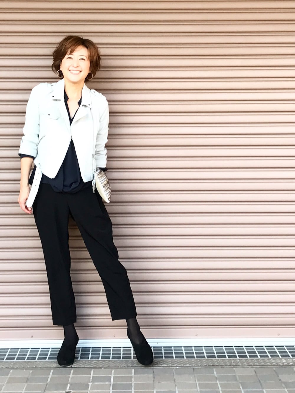 大人カジュアルstyle ハードなイメージのライダースジャケットを やさしい雰囲気にコーディネート