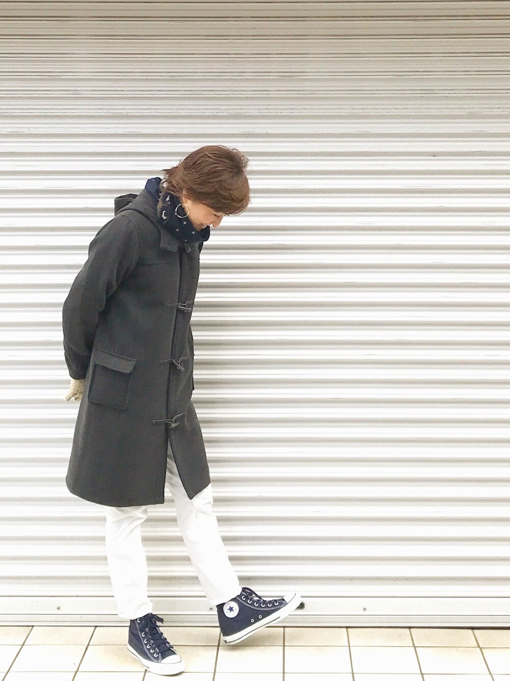 大人カジュアルコーディネート コンバースを使った春ファッション …… …… …… 春 3月 あたたかな日差しだけど風がまだ冷たい日 足もとから春を意識したらstyle ストールのネイビーとスニーカーのネイビー トーンを合わせて全体をまとめてみました^^