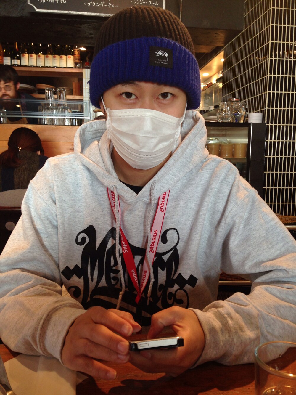オオクボッキ、展示会廻り花粉症スタイル。流行りの😷にSUPREMEのネックストラップで攻める上級ストリートスタイル。少し毛羽立ったstussyのニットキャップもツートンカラーで最前線。