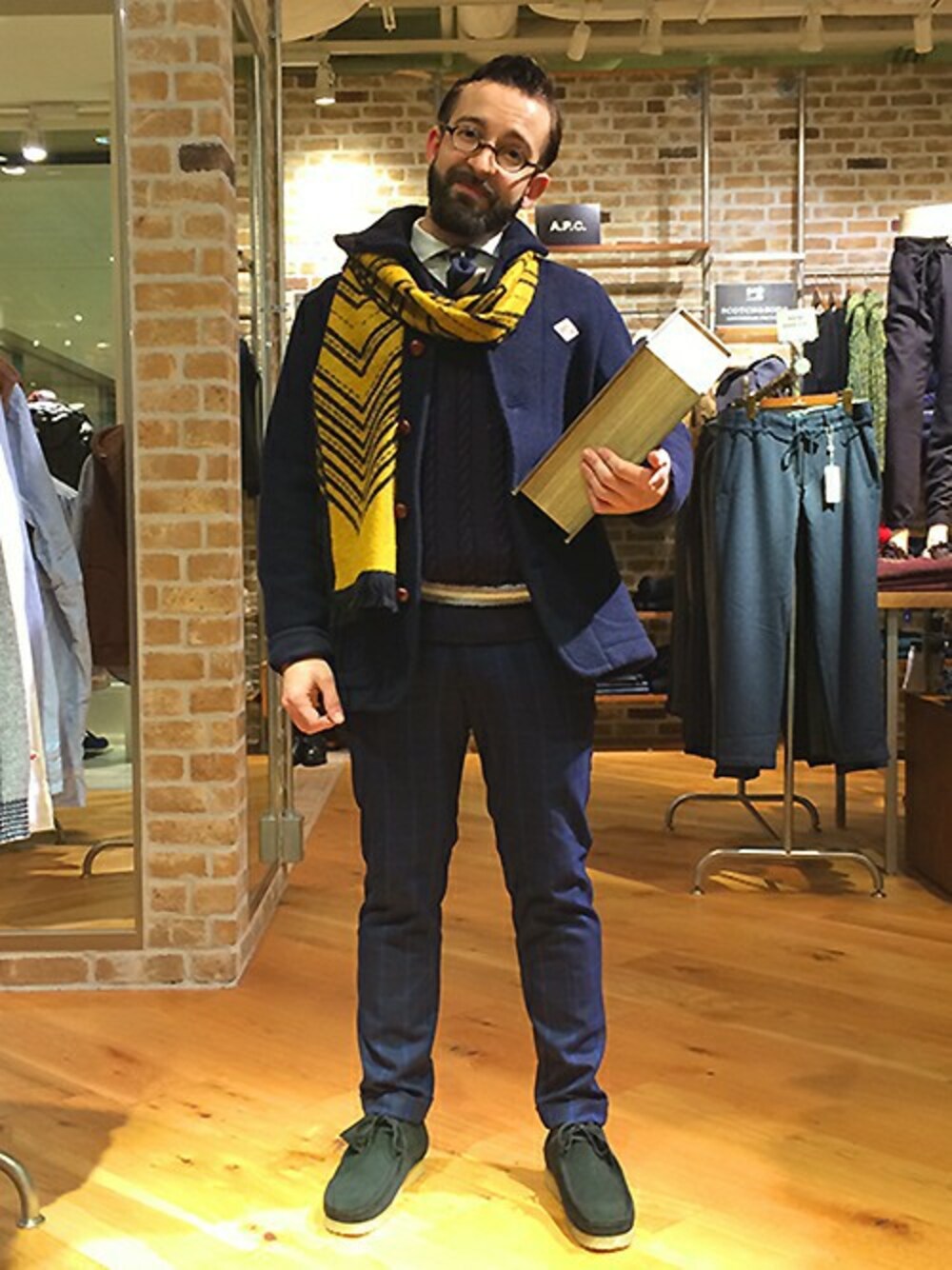 ベーシックなメルトンコートにヴィヴィッドなイエローのマフラーが映えるプレッピースタイル。 ネイビーの清潔感はそのままに、小物使いでアクセントをつけた大人のこだわりの詰まったコーデ。 ケーブルニットとパンツにさりげなく入ったチェックの柄×柄の着こなしに ネクタイを合わせて、おしゃれ上級者を狙ってみては?